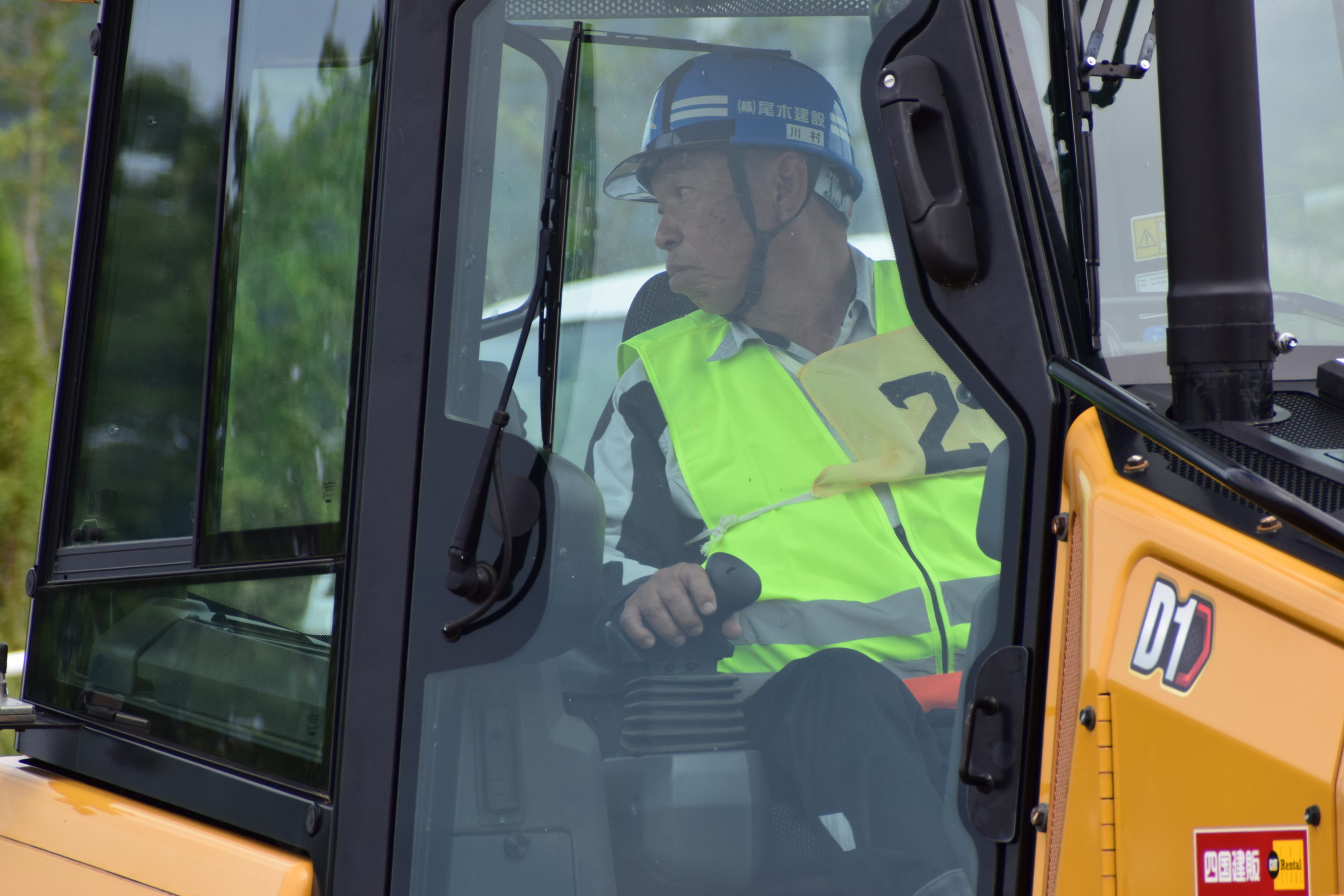四国建販予選では、愛媛/高知/徳島の3県のお客様6社から6選手が出場、ブルドーザ、ホイールローダ、油圧ショベルの3機を操り、3つの競技でポイントの最も高い1名を決定。競技内容は直前まで選手には伝えられないルールで、日頃の技術を競い合いました。